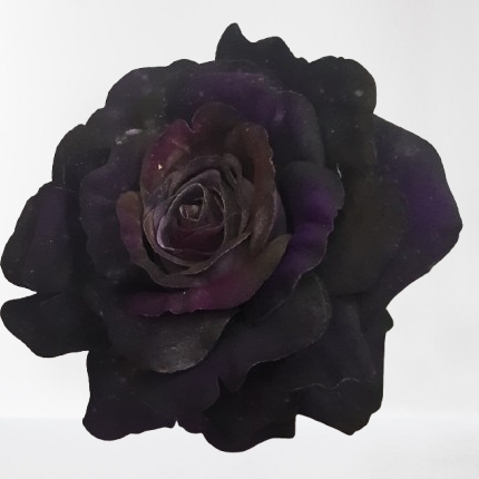 Elegancka, niezwykle efektowna róża wykonana z welurowego materiału, który nadaje jej głębi i luksusowego wyglądu. Kwiat jest duży, pięknie uformowany i przyciąga uwagę intensywnym, bardzo ciemnym fioletem.