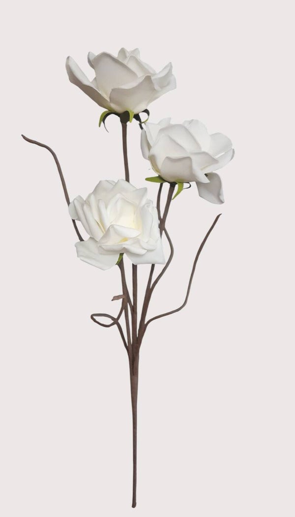 Ta gałązka to naprawdę efektowna dekoracja. Na jednej, długiej łodydze znajdują się trzy duże, pełne kwiaty wykonane z miękkiej, elegancko uformowanej pianki. Płatki wyglądają naturalnie, a całość jest lekka, estetyczna i bardzo dekoracyjna.