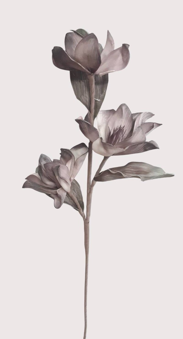 Subtelna, a jednocześnie bardzo efektowna gałązka o egzotycznym charakterze. Na jednej łodydze znajdują się trzy kwiaty o średnicy około 14 cm – pełne, dobrze wyprofilowane i wykonane z trwałej, lekkiej pianki, dzięki czemu prezentują się naturalnie i elegancko.