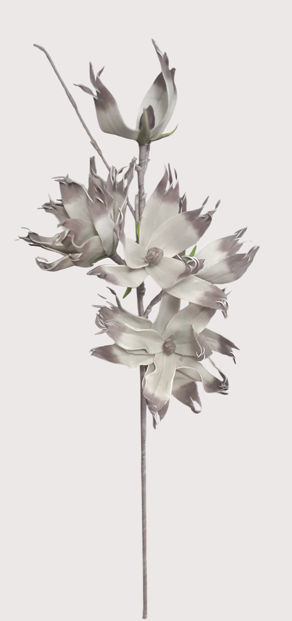 Efektowna, wyrazista gałązka o egzotycznym charakterze. Na jednej, długiej łodydze znajduje się pięć dużych kwiatów o średnicy około 23 cm – pełnych, szeroko otwartych i wykonanych z lekkiej, elegancko uformowanej pianki.