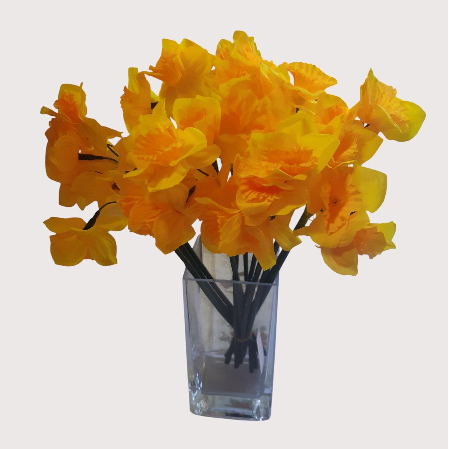 Dekoracyjna wiązka żonkili o wysokości 40 cm. W skład wiązki wchodzi 12 gałązek, a na każdej z nich znajdują się 3 kwiaty o średnicy ok. 8 cm. Całość tworzy gęstą, efektowną kompozycję, idealną do bukietów, dekoracji wazonowych oraz aranżacji wiosennych.
