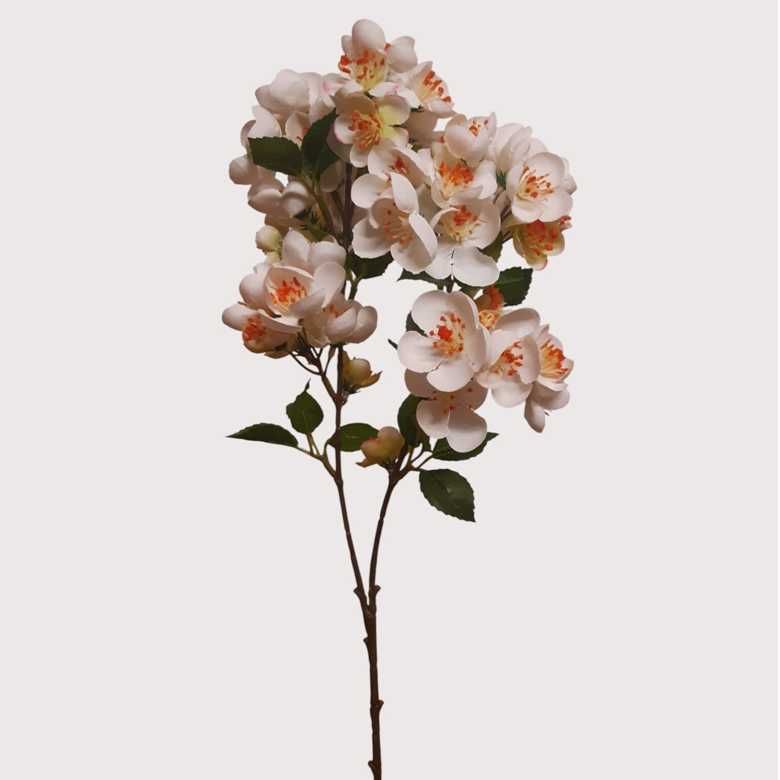Dekoracyjna gałązka jabłoni obsypana drobnymi kwiatuszkami. Lekka, naturalnie wyglądająca forma idealna do wiosennych kompozycji, bukietów oraz dekoracji wnętrz.