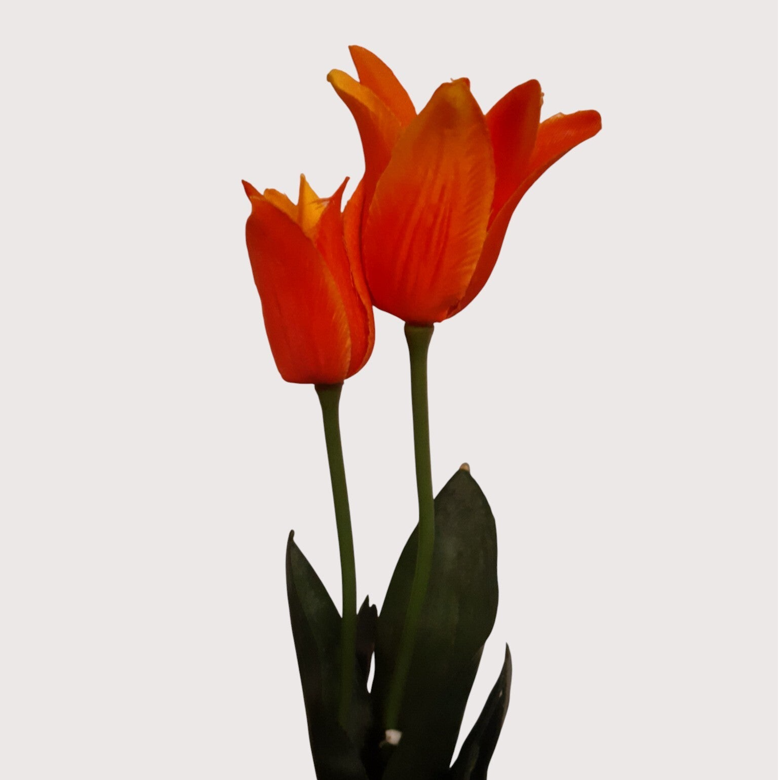 Dekoracyjne tulipany na cebulce, wykonane z tworzywa sztucznego. Realistyczny wygląd podkreślają liście oraz korzonki wystające z cebulki. Idealny do wiosennych aranżacji, kompozycji w doniczkach i dekoracji stołu.