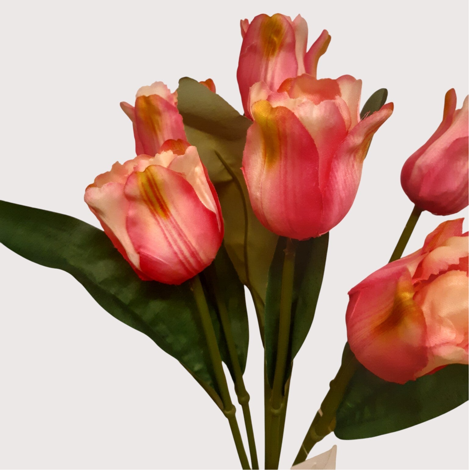 Bukiet składający się z 7 tulipanów z liśćmi, wykonanych z materiału. Kwiaty o średnicy ok. 7 cm, naturalnie odwzorowane, idealne do wazonów, dekoracji florystycznych i kompozycji wiosennych.