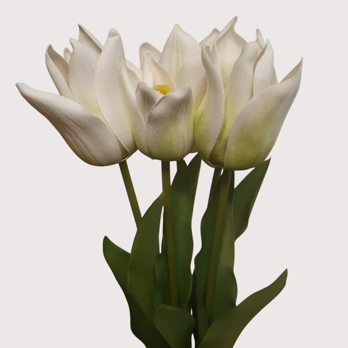 Wiązka 5 tulipanów z liśćmi, z kwiatami wykonanymi z lateksu. Realistyczny wygląd i naturalne wykończenie sprawiają, że świetnie nadaje się do bukietów, wazonów i dekoracji florystycznych.
