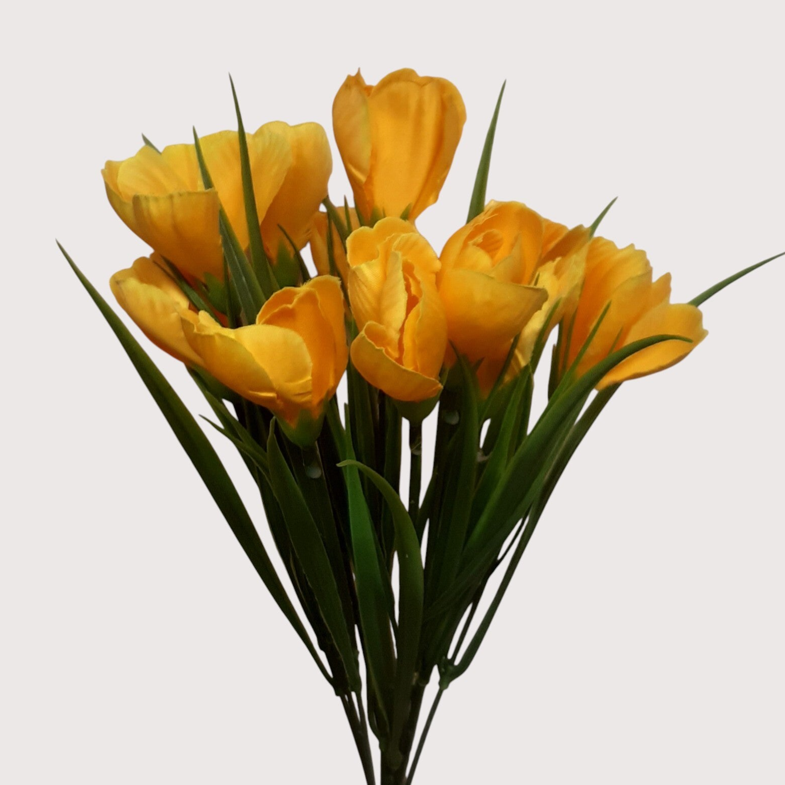 Dekoracyjny bukiet krokusów na piku o wysokości 36 cm. Zawiera 11 kwiatków o średnicy ok. 5 cm, osadzonych wśród zielonych traw, tworząc naturalną i lekką kompozycję. Idealny do wiosennych dekoracji, bukietów i aranżacji florystycznych.