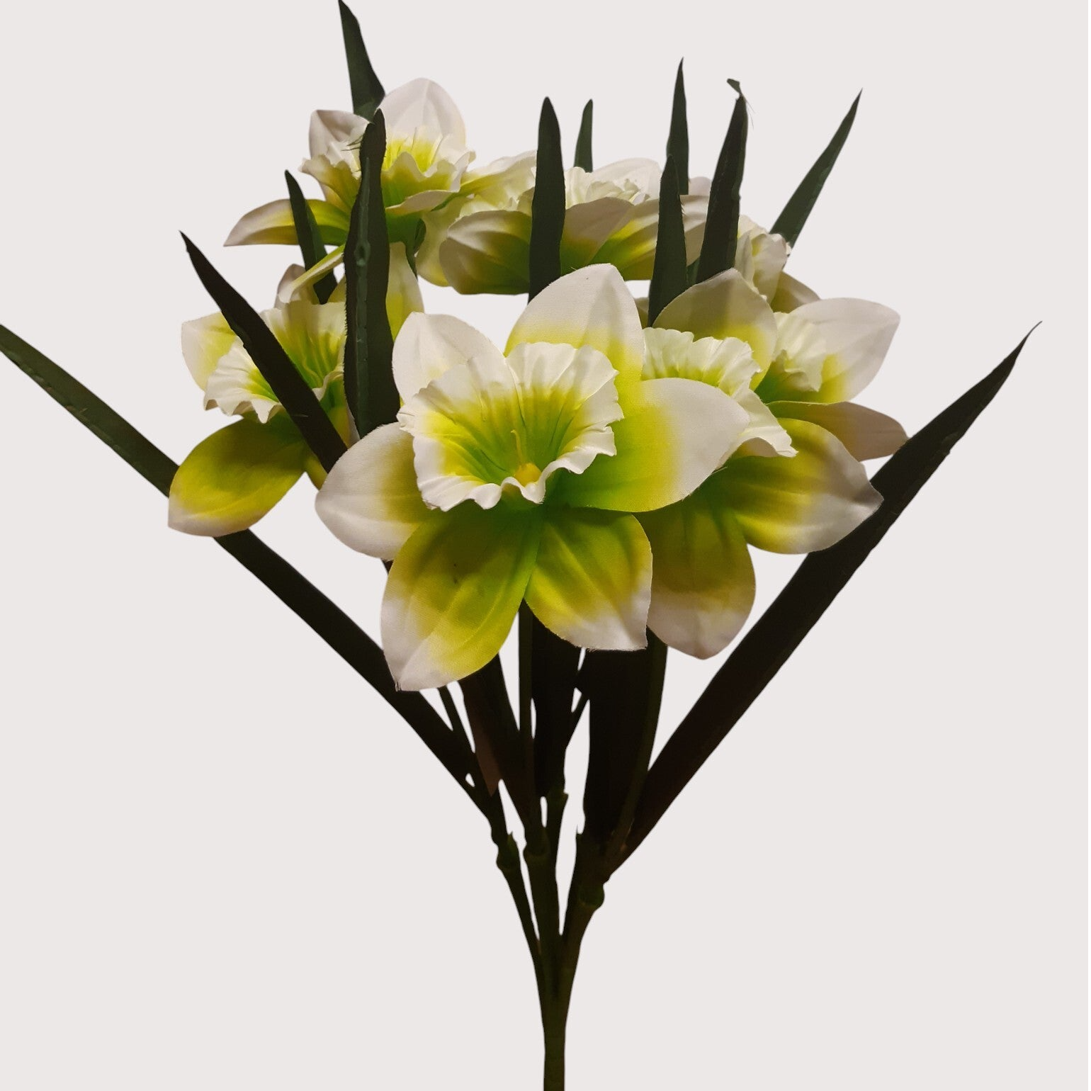 Dekoracyjny bukiet żonkili o wysokości 57 cm, składający się z 7 materiałowych kwiatów z listkami. Lekka, wiosenna forma idealna do wazonów, kompozycji florystycznych i sezonowych aranżacji.