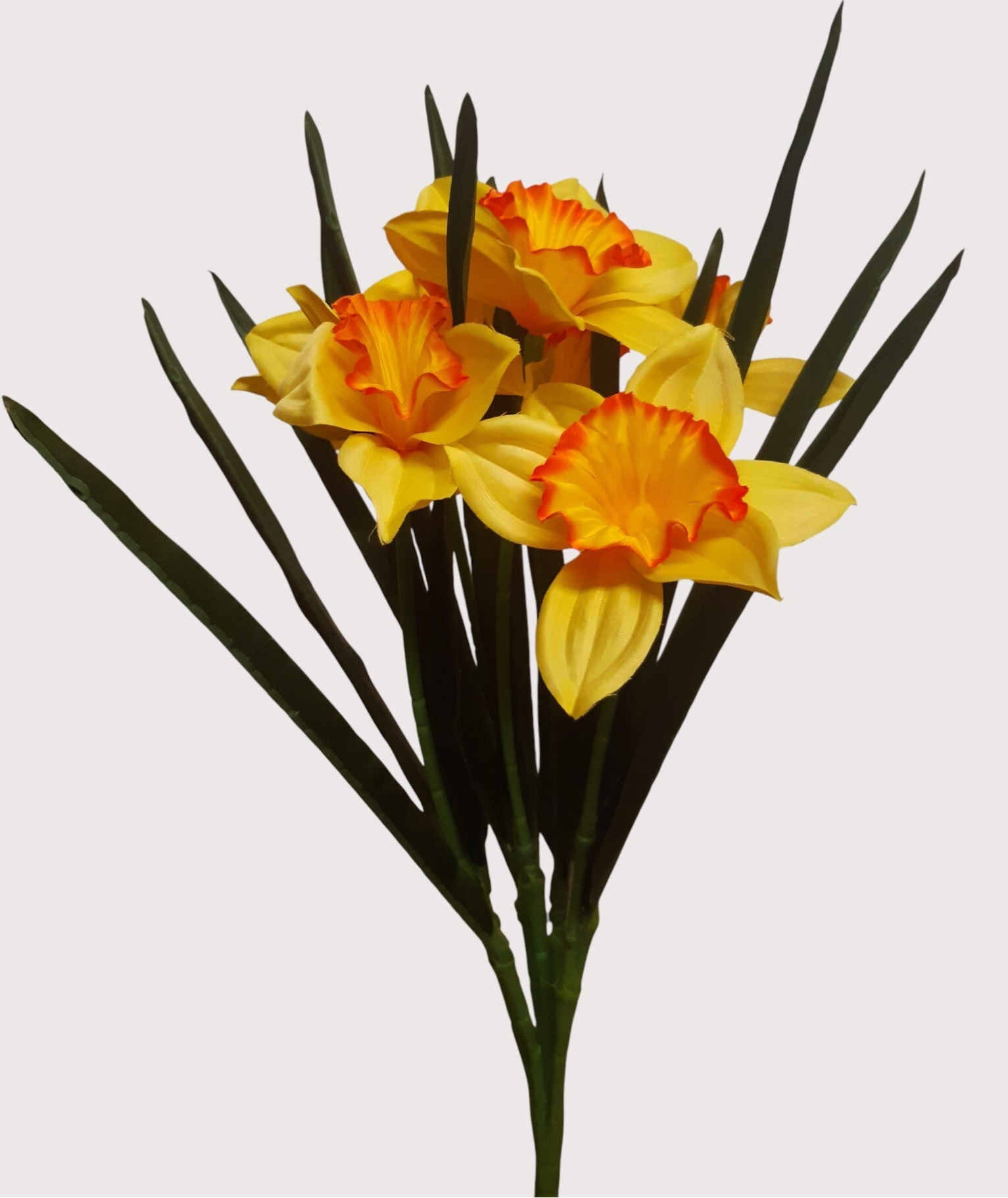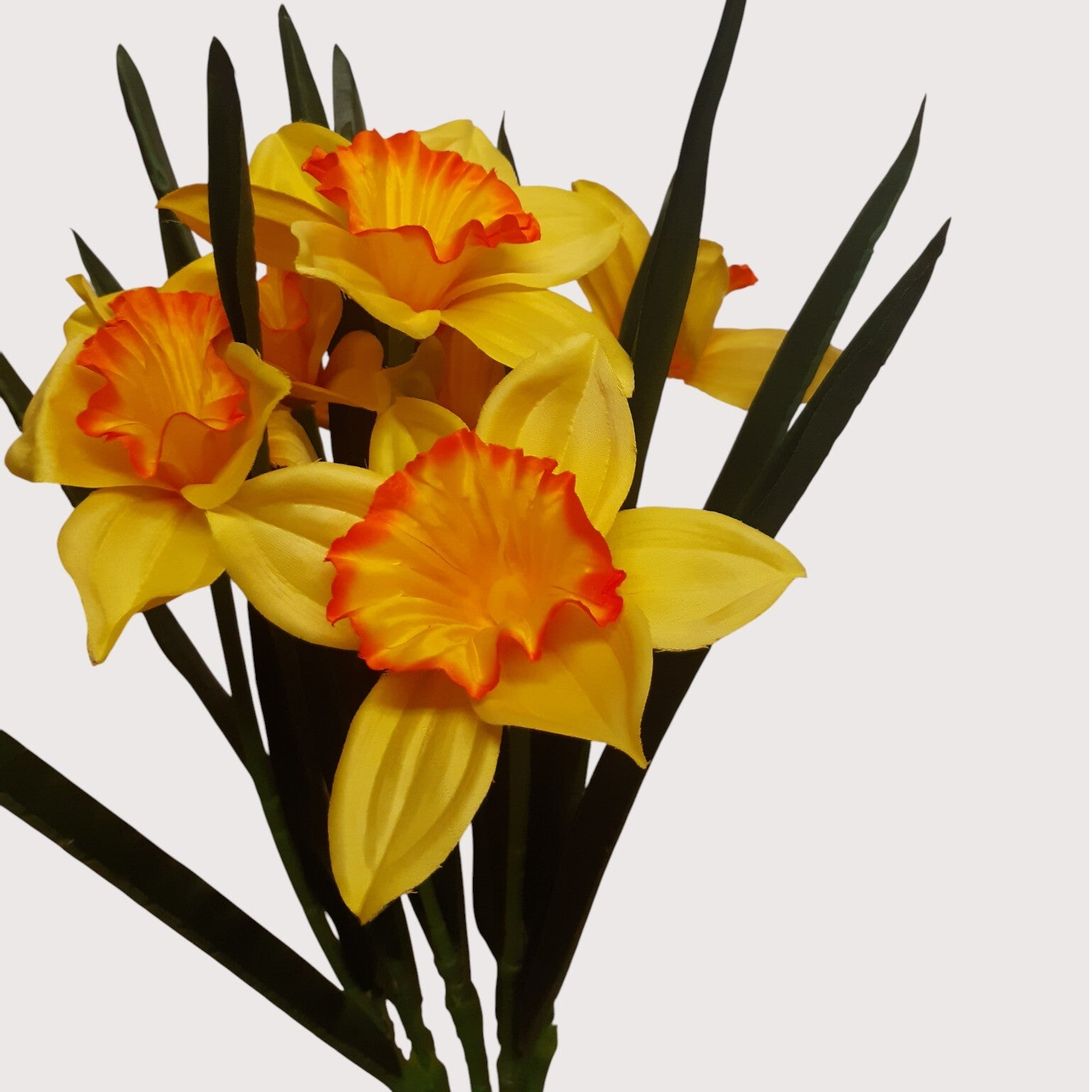 Dekoracyjny bukiet żonkili o wysokości 57 cm, składający się z 7 materiałowych kwiatów z listkami. Lekka, wiosenna forma idealna do wazonów, kompozycji florystycznych i sezonowych aranżacji.
