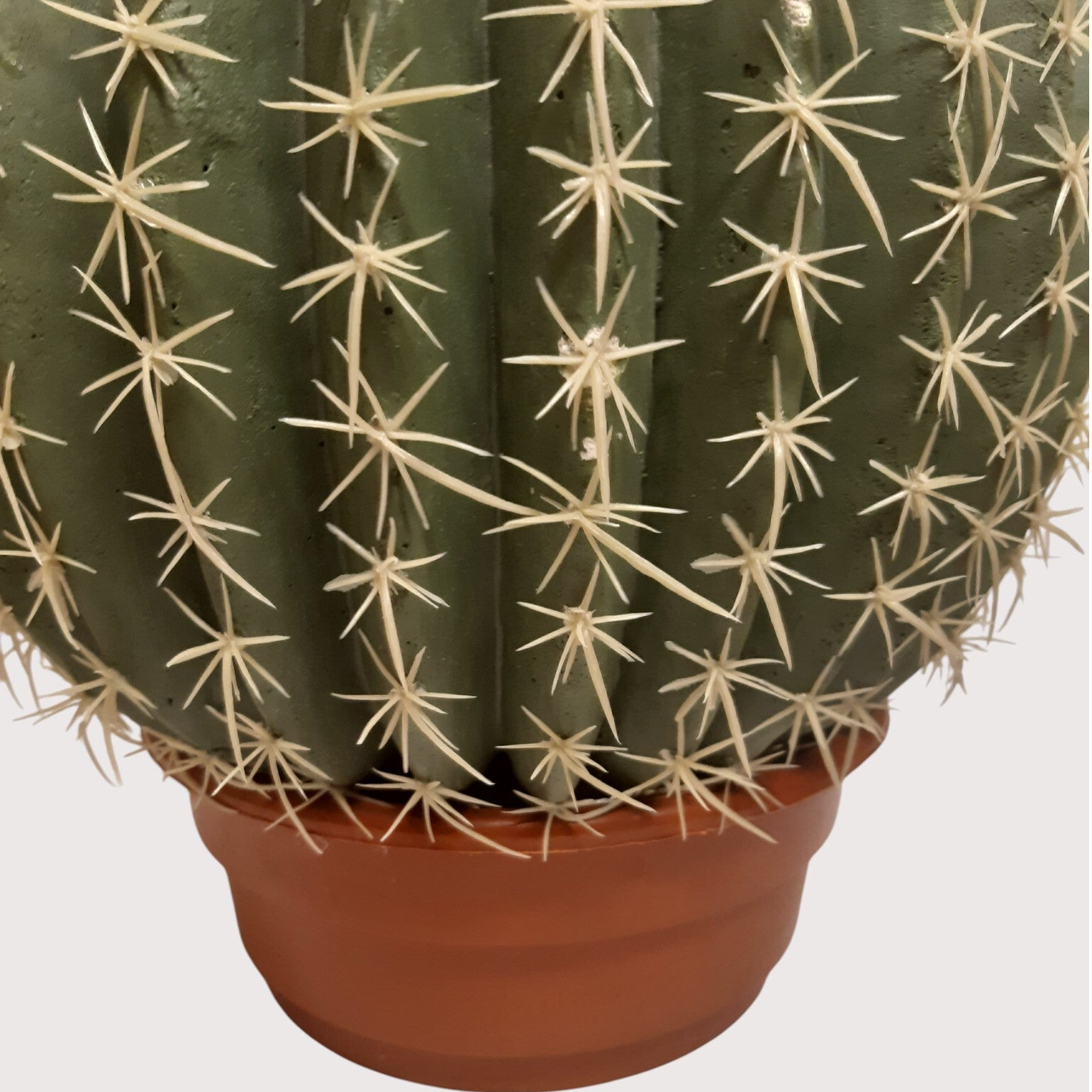Dekoracyjny kaktus w formie kuli o średnicy 30 cm, osadzony w plastikowej doniczce o wysokości 9 cm. Realistyczny wygląd sprawia, że świetnie pasuje do nowoczesnych wnętrz i aranżacji typu urban jungle.
