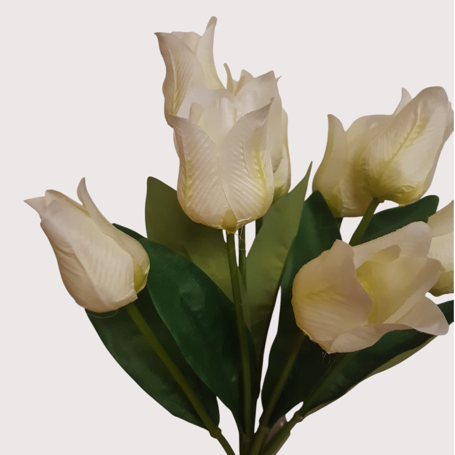 Bukiet tulipanów o wysokości 42 cm, składający się z 7 materiałowych kwiatów oraz liści. Naturalnie odwzorowane kwiaty i liście tworzą efektowną, gęstą kompozycję, idealną do wazonów, bukietów i dekoracji florystycznych.
