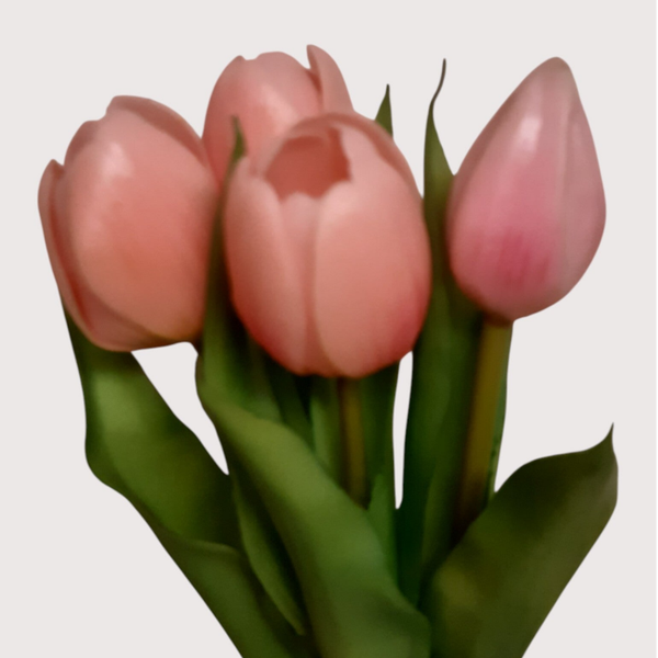 Wiązka tulipanów wykonana w całości z silikonu, o wysokości 31 cm. Składa się z 5 kwiatów – 3 większych pączków i 2 mniejszych, tworząc realistyczną i efektowną kompozycję do wazonów i dekoracji florystycznych.