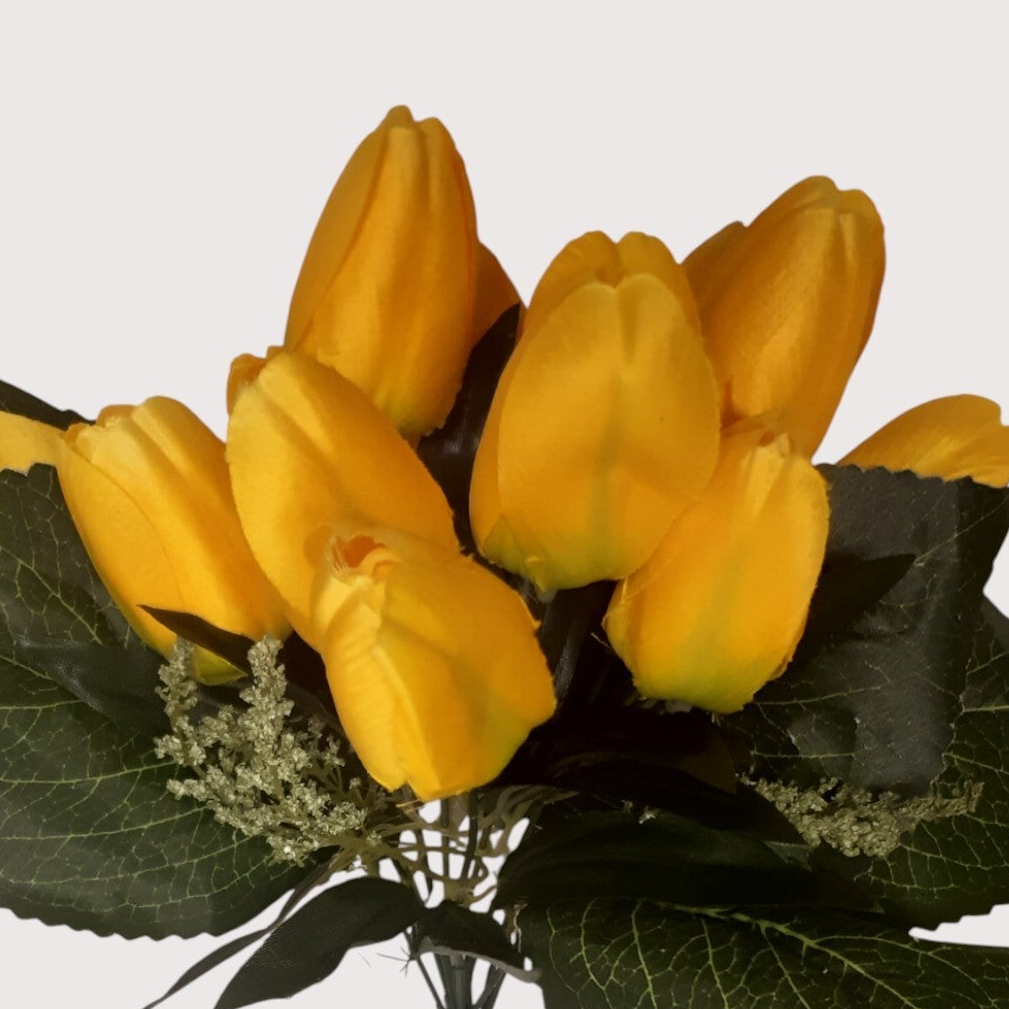 Bogaty bukiet tulipanów o wysokości 35 cm, składający się z 12 materiałowych kwiatów oraz dużej ilości liści. Gęsta, efektowna kompozycja idealna do wazonów, dekoracji florystycznych i sezonowych aranżacji.