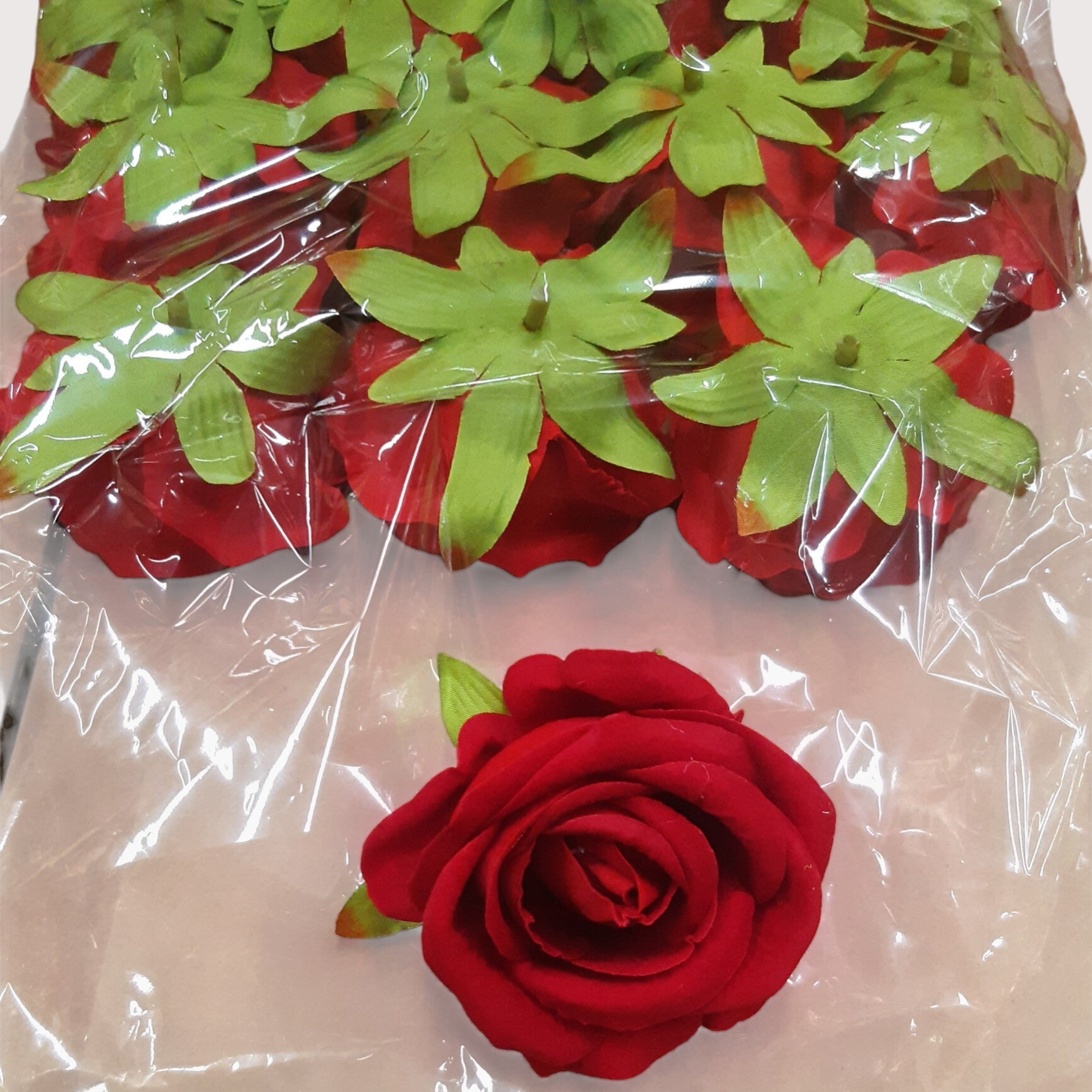 Róże wyrobowe wykonane z materiału, o średnicy kwiatu ok. 6 cm. W opakowaniu znajduje się 12 sztuk samych kwiatów, bez łodyg – idealne do drobnych kompozycji florystycznych, stroików, dekoracji i projektów DIY.