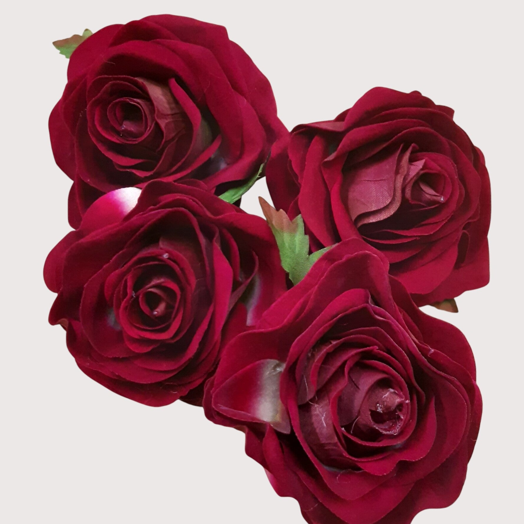 Welurowe róże wyrobowe o średnicy ok. 9 cm, w opakowaniu po 12 sztuk. Same kwiaty, bez łodyg – idealne do eleganckich kompozycji florystycznych, stroików, boxów kwiatowych i projektów DIY.