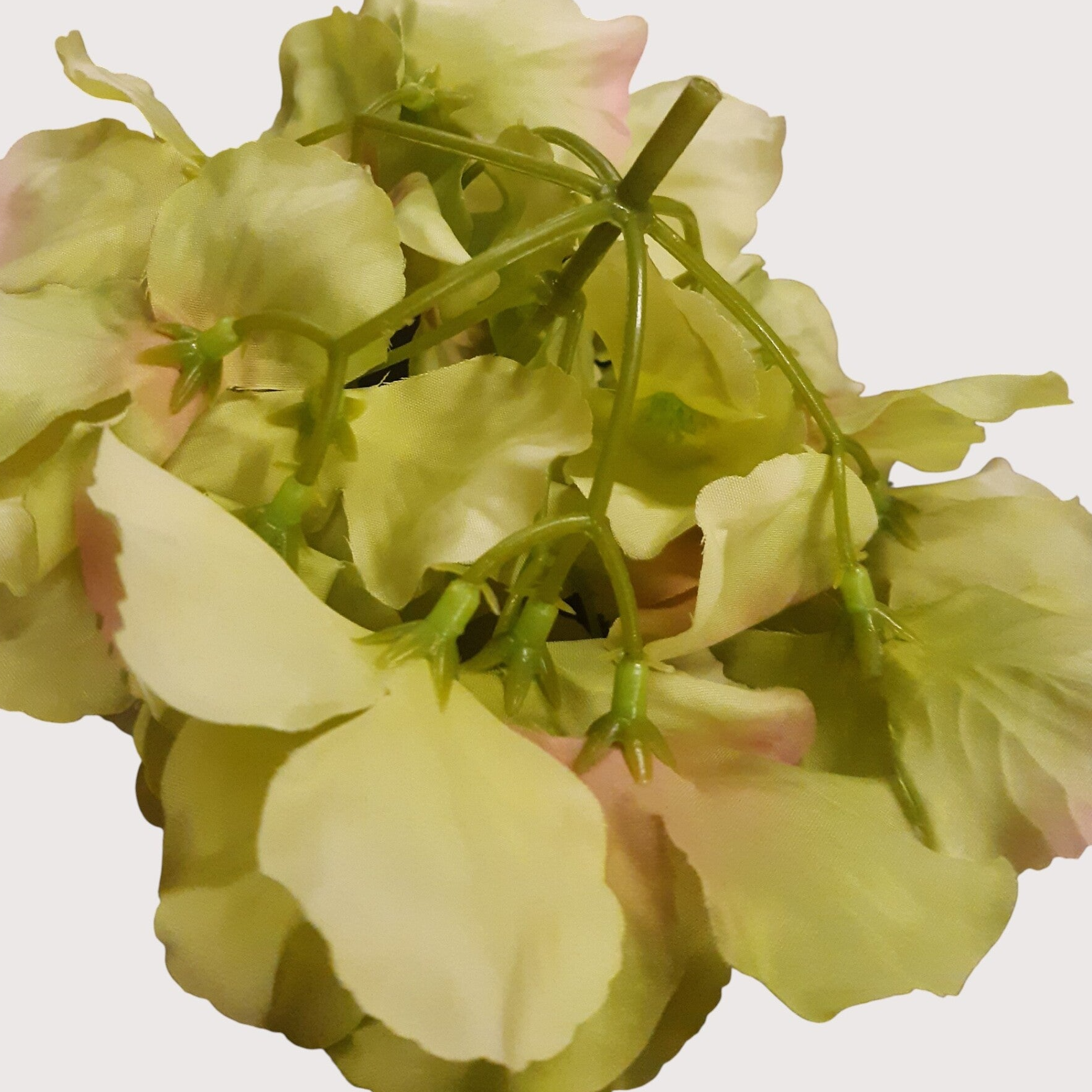 Hortensja wyrobowa wykonana z materiału, w formie samego kwiatu, bez gałązki. Duża, efektowna główka idealna do kompozycji florystycznych, boxów kwiatowych, stroików i dekoracji DIY.