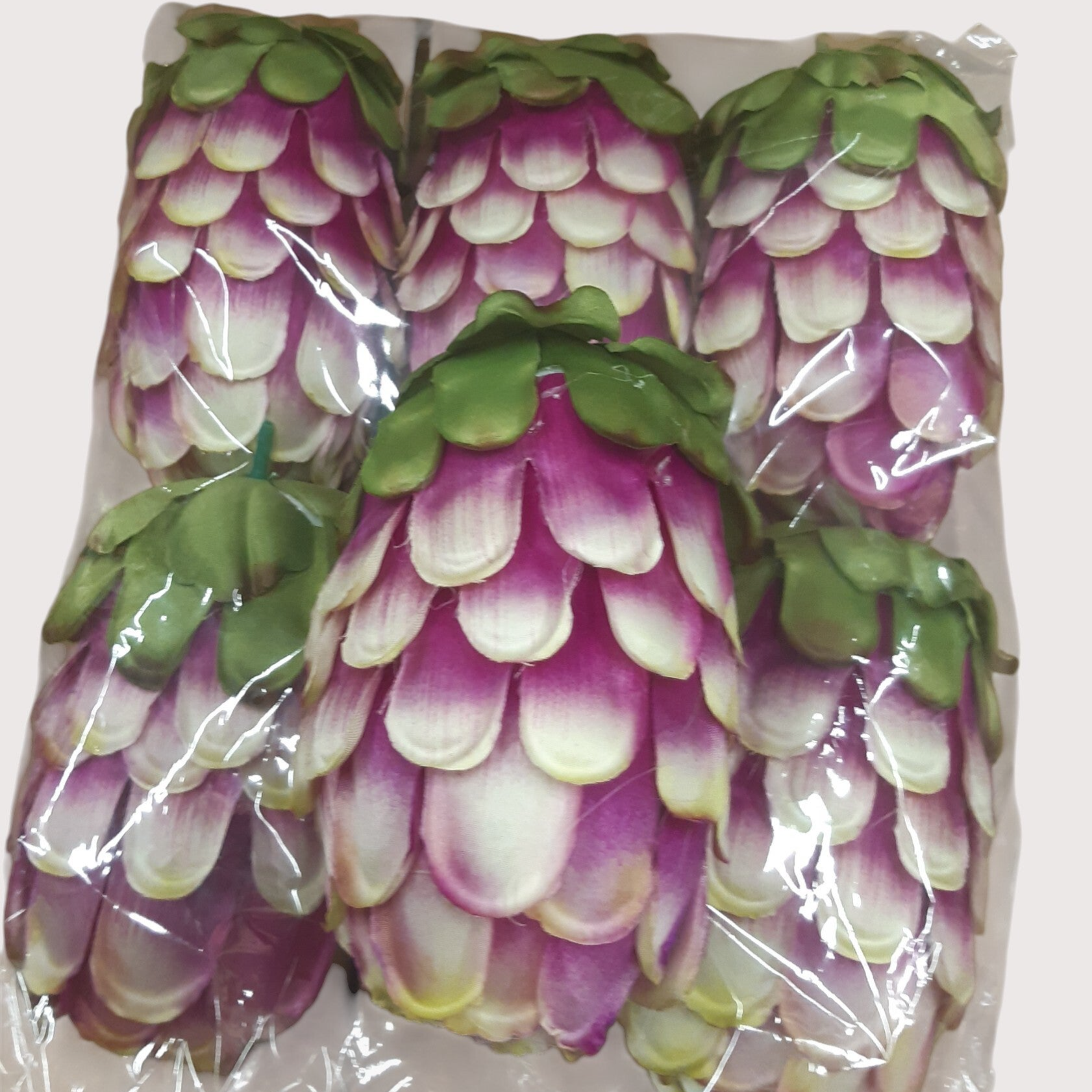 Karczochy wyrobowe wykonane z materiału, z usztywnioną konstrukcją. W opakowaniu znajduje się 6 sztuk samych kwiatów, bez łodyg – idealne do nowoczesnych kompozycji florystycznych, stroików i dekoracji DIY.