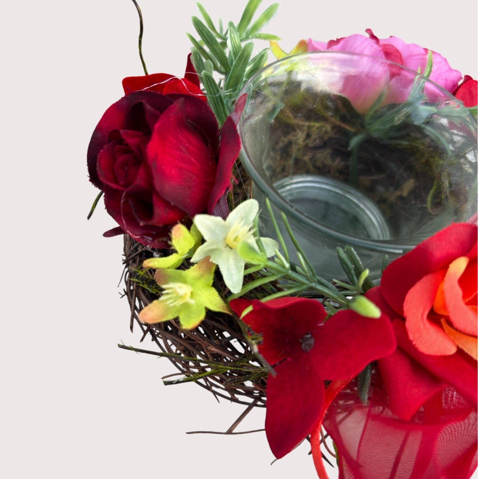 Świecznik dekoracyjny w doniczce, ozdobiony sztucznymi kwiatami.