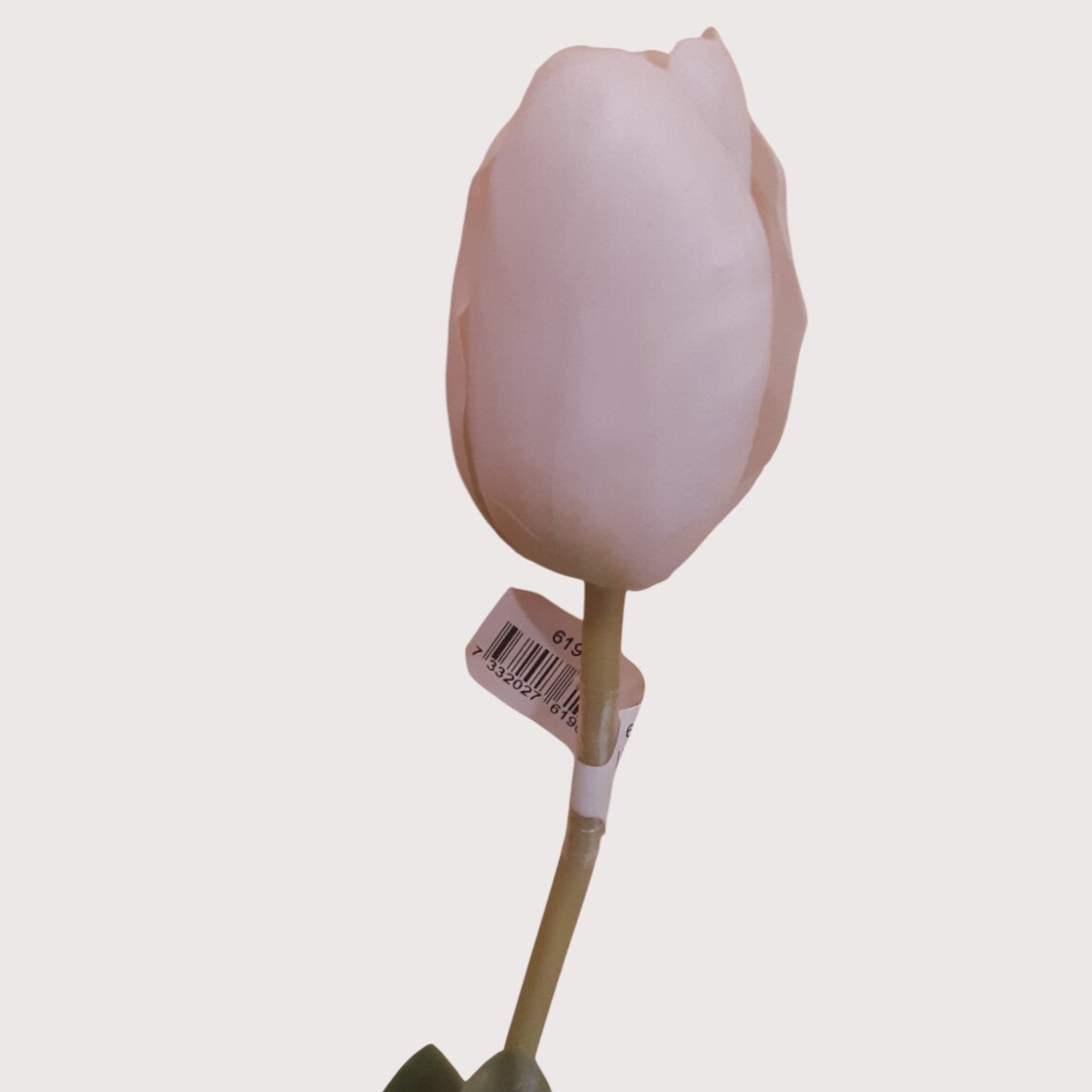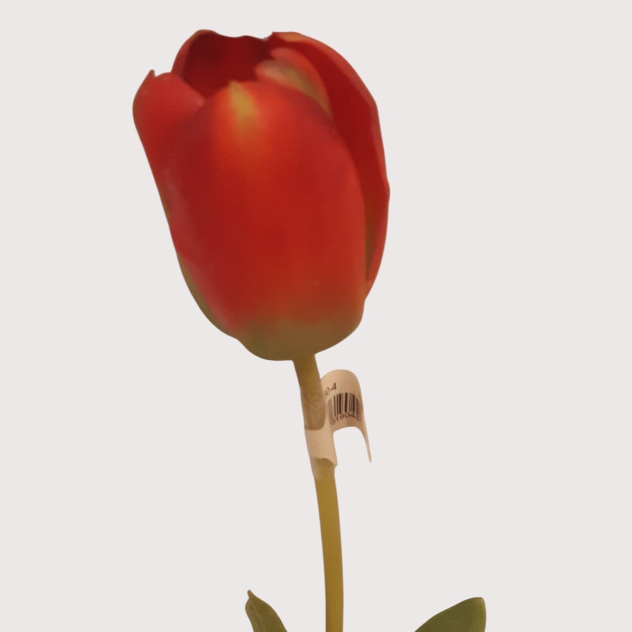 Realistyczny tulipan wykonany z silikonu, o naturalnym wyglądzie i elastycznych płatkach.