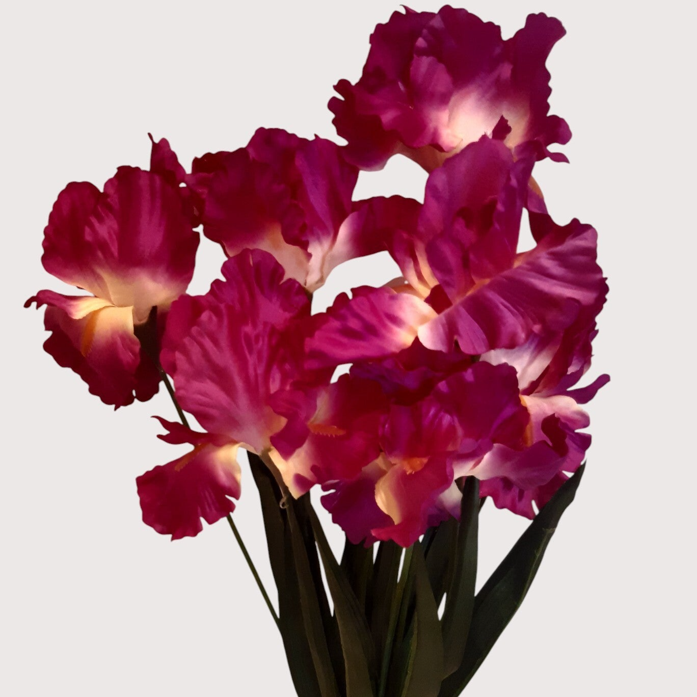 Dekoracyjny bukiet irysów z siedmioma kwiatami i liśćmi, o naturalnym wyglądzie.