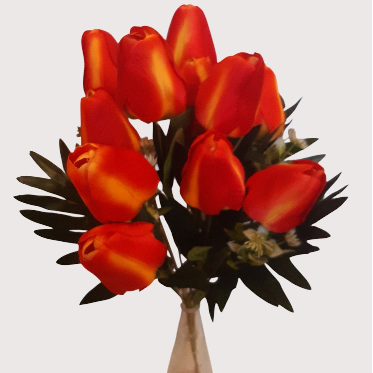 Dekoracyjny bukiet tulipanów z jedenastoma kwiatami, o estetycznym i naturalnym wyglądzie. Idealny do wazonów, kompozycji florystycznych oraz dekoracji wnętrz.