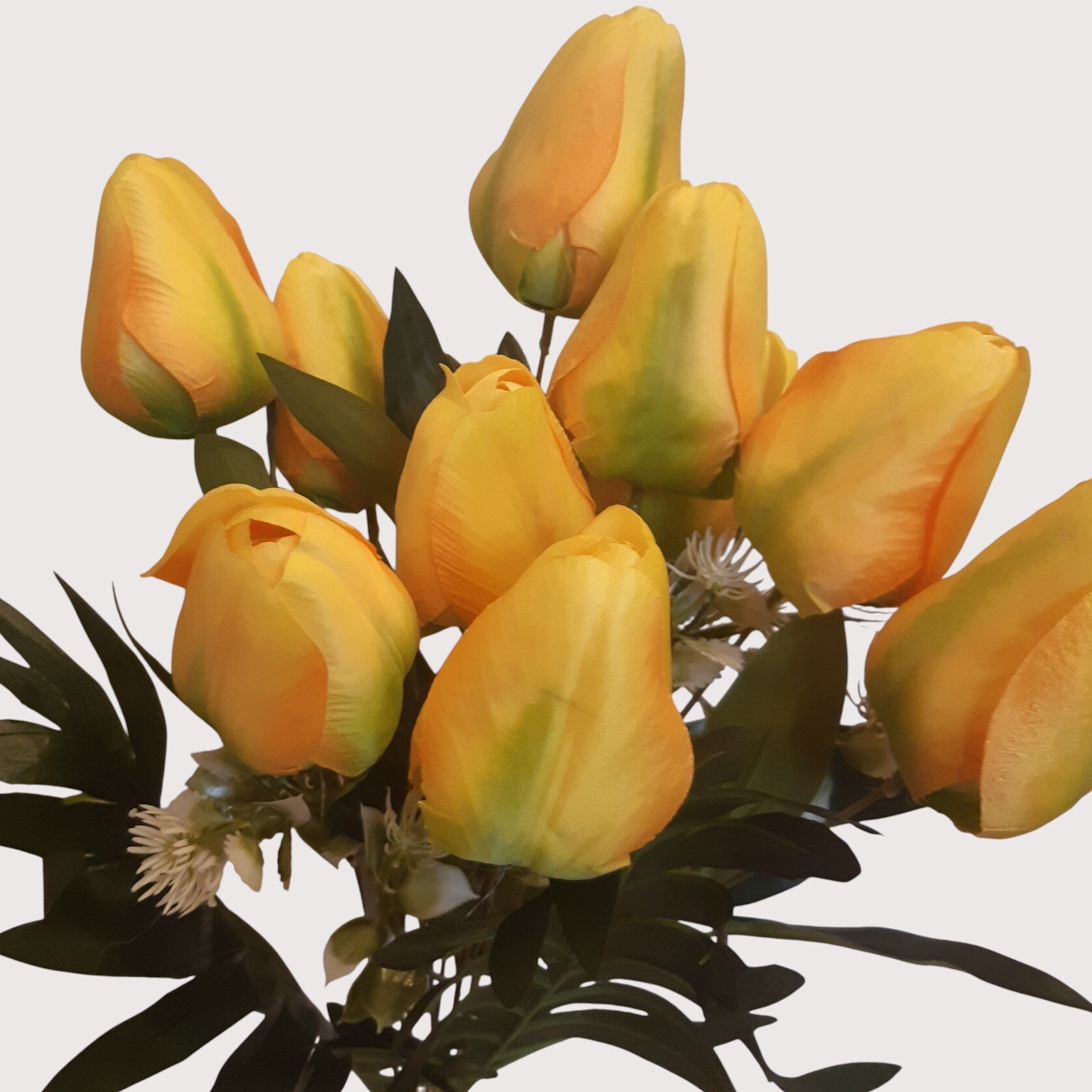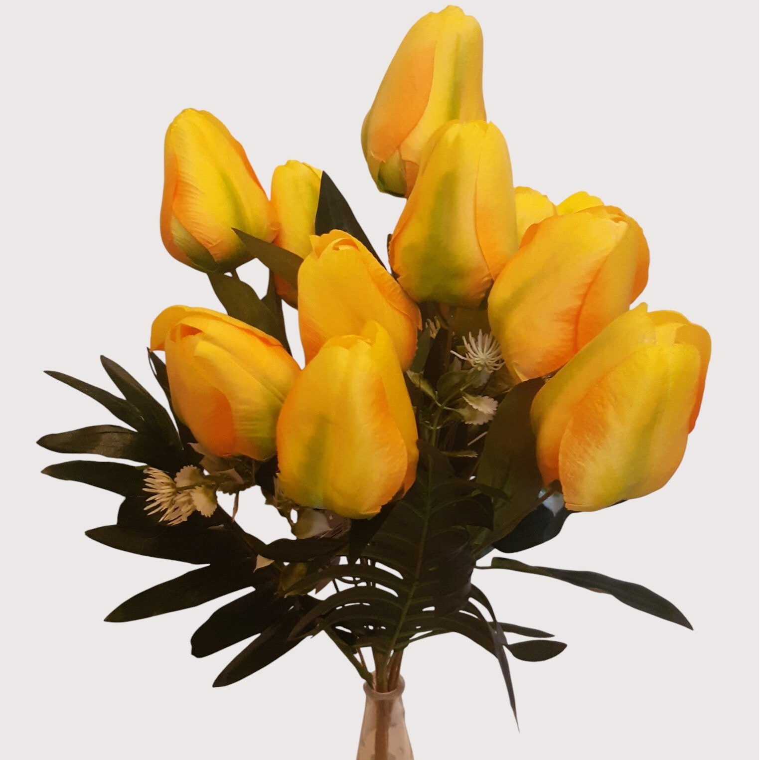 Dekoracyjny bukiet tulipanów z jedenastoma kwiatami, o estetycznym i naturalnym wyglądzie. Idealny do wazonów, kompozycji florystycznych oraz dekoracji wnętrz.