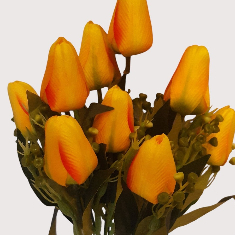 Dekoracyjny bukiet tulipanów z dziewięcioma kwiatami, o naturalnym i estetycznym wyglądzie. Świetnie sprawdzi się w mniejszych wazonach, stroikach i aranżacjach wnętrz.