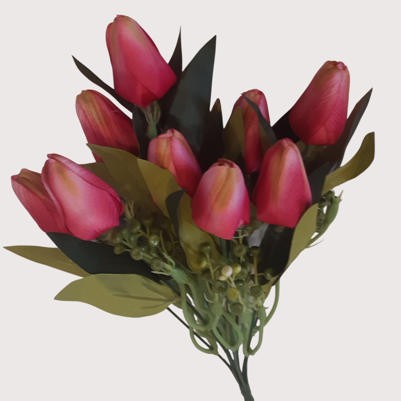 Dekoracyjny bukiet tulipanów z dziewięcioma kwiatami, o naturalnym i estetycznym wyglądzie. Świetnie sprawdzi się w mniejszych wazonach, stroikach i aranżacjach wnętrz.