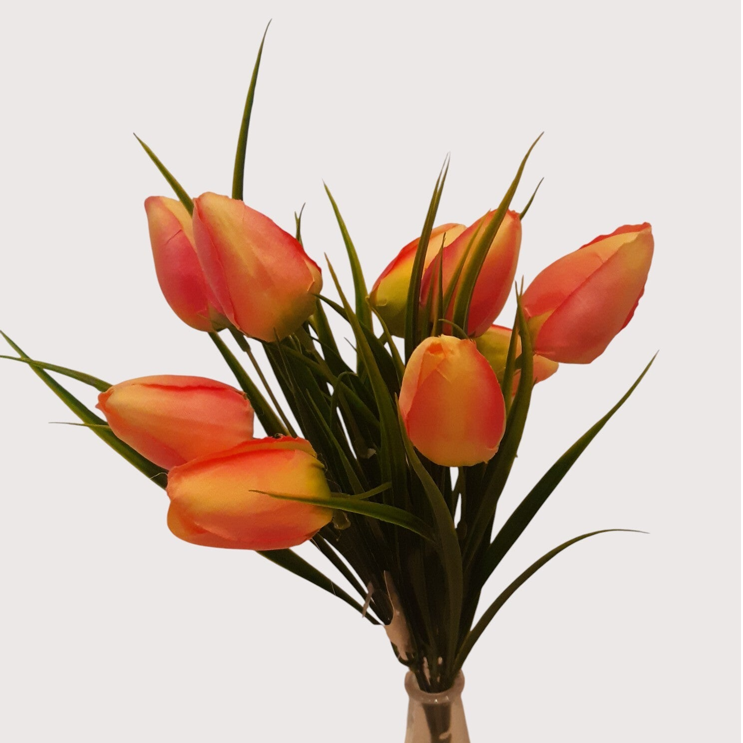 Dekoracyjny bukiet tulipanów z trawą i dziewięcioma kwiatami, o naturalnym wyglądzie.