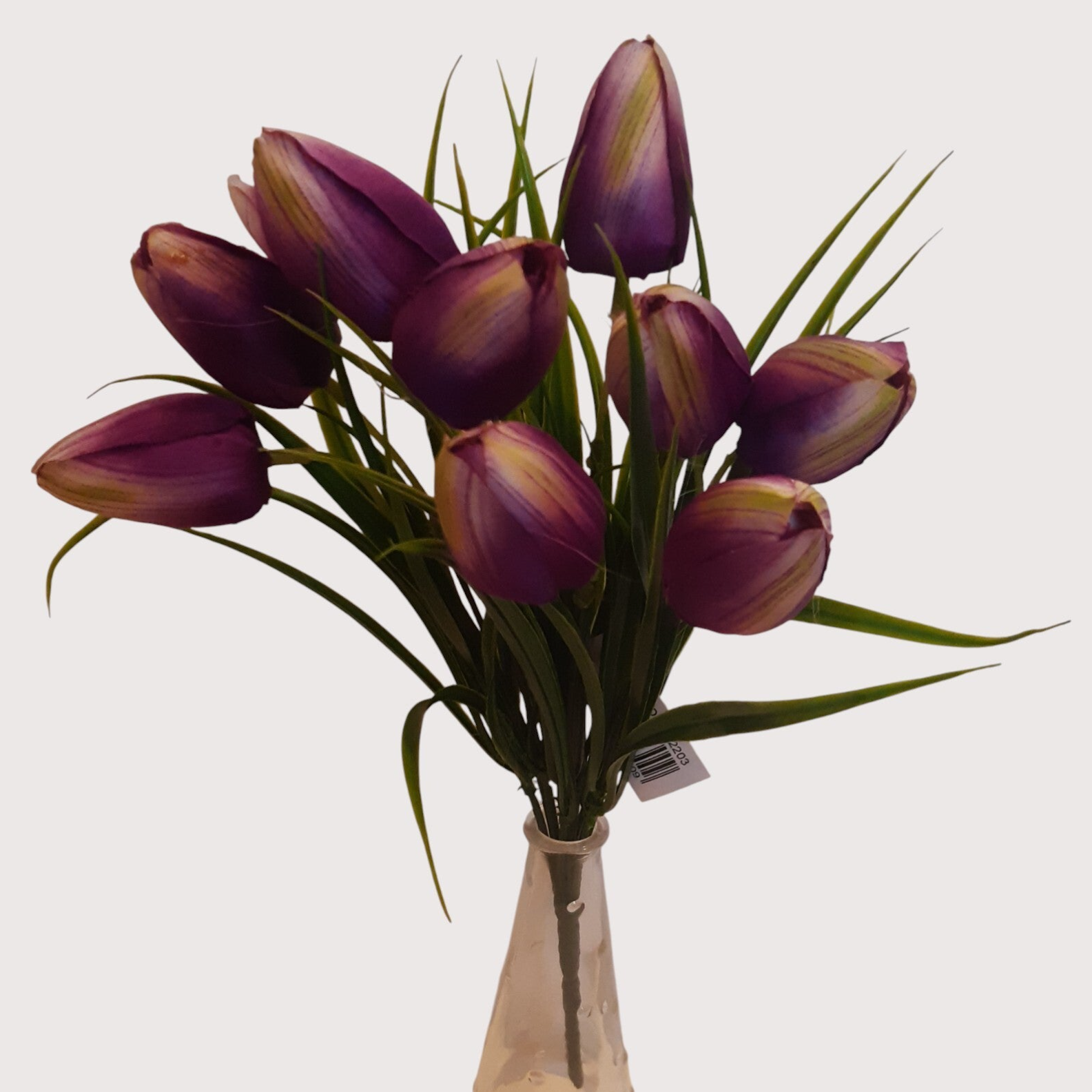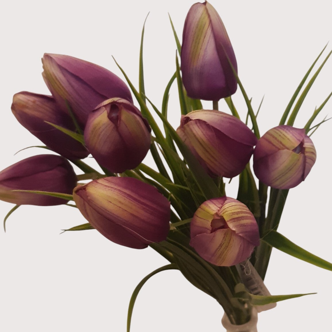 Tulipan – bukiet z trawą 9 kwiatów 35 cm, fiolet z białym, kod: 2203