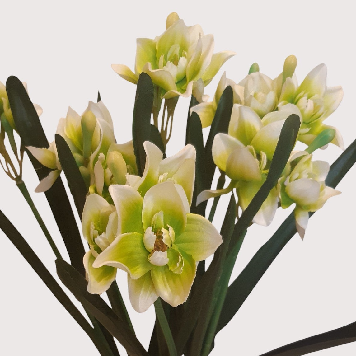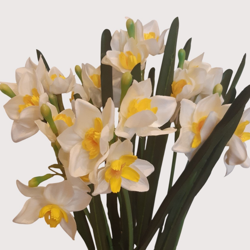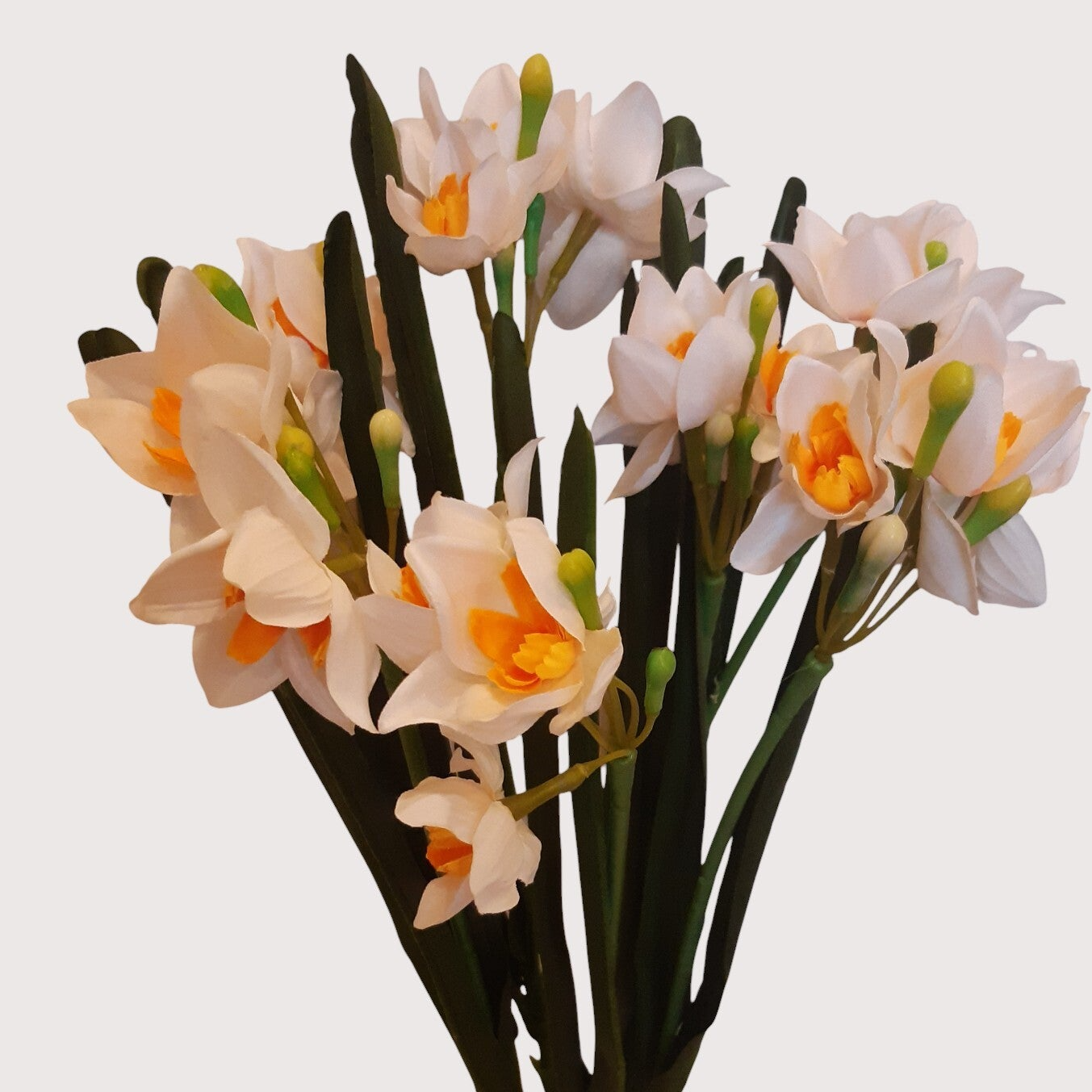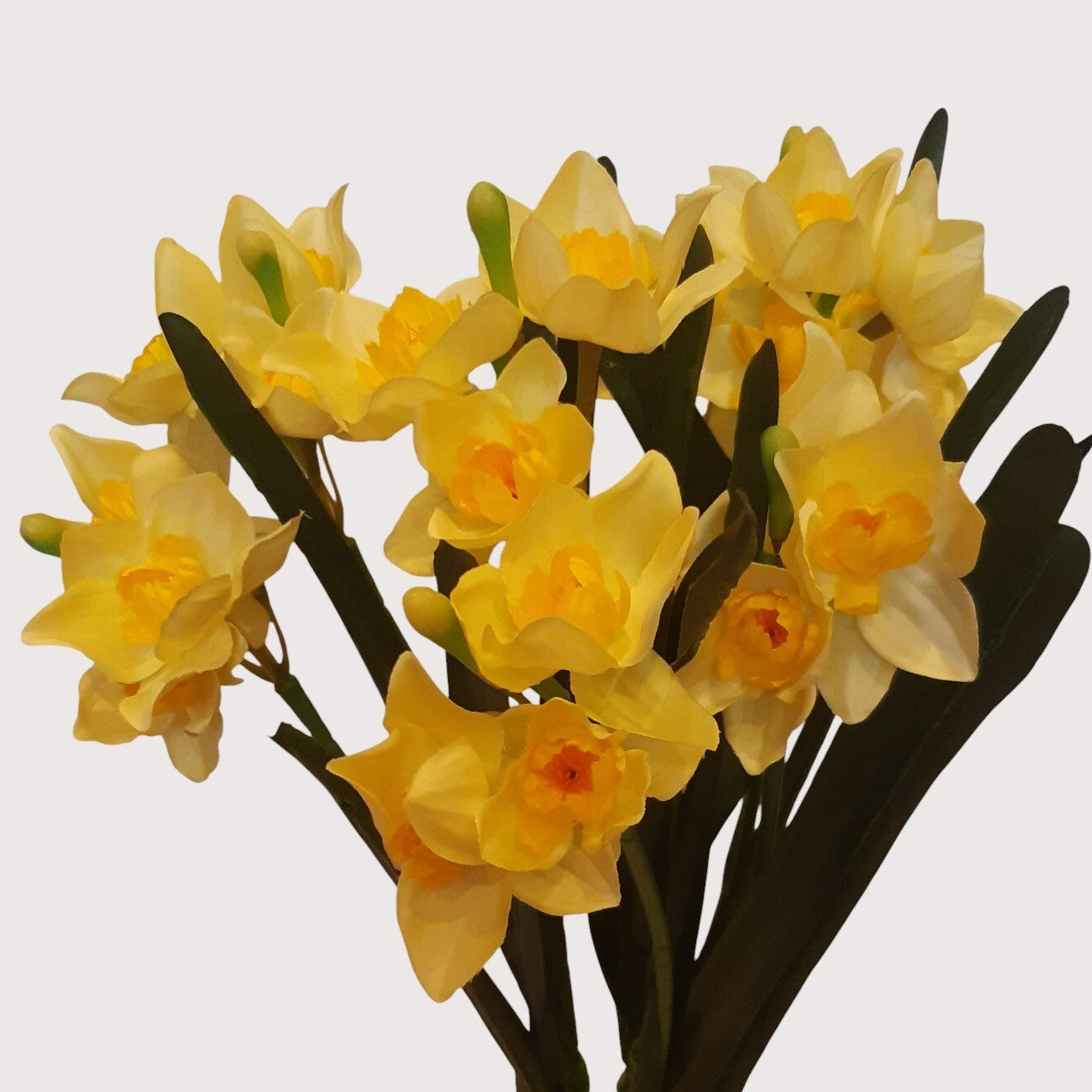 Dekoracyjny bukiet narcyzów z siedmioma gałązkami, o naturalnym i estetycznym wyglądzie.