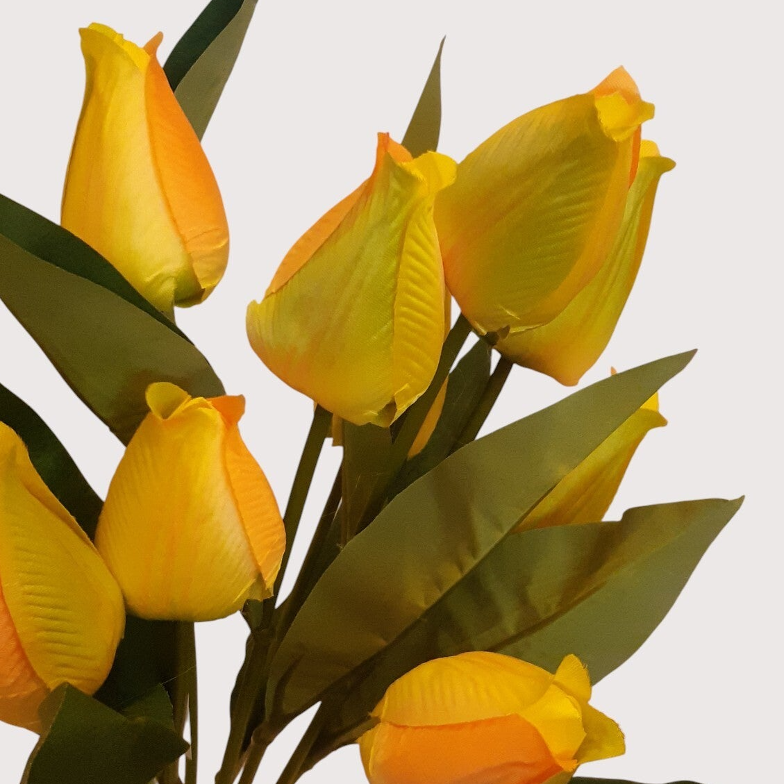 Dekoracyjny bukiet tulipanów z dziewięcioma kwiatami, o naturalnym wyglądzie.Idealny do wazonów, kompozycji florystycznych oraz aranżacji wnętrz.