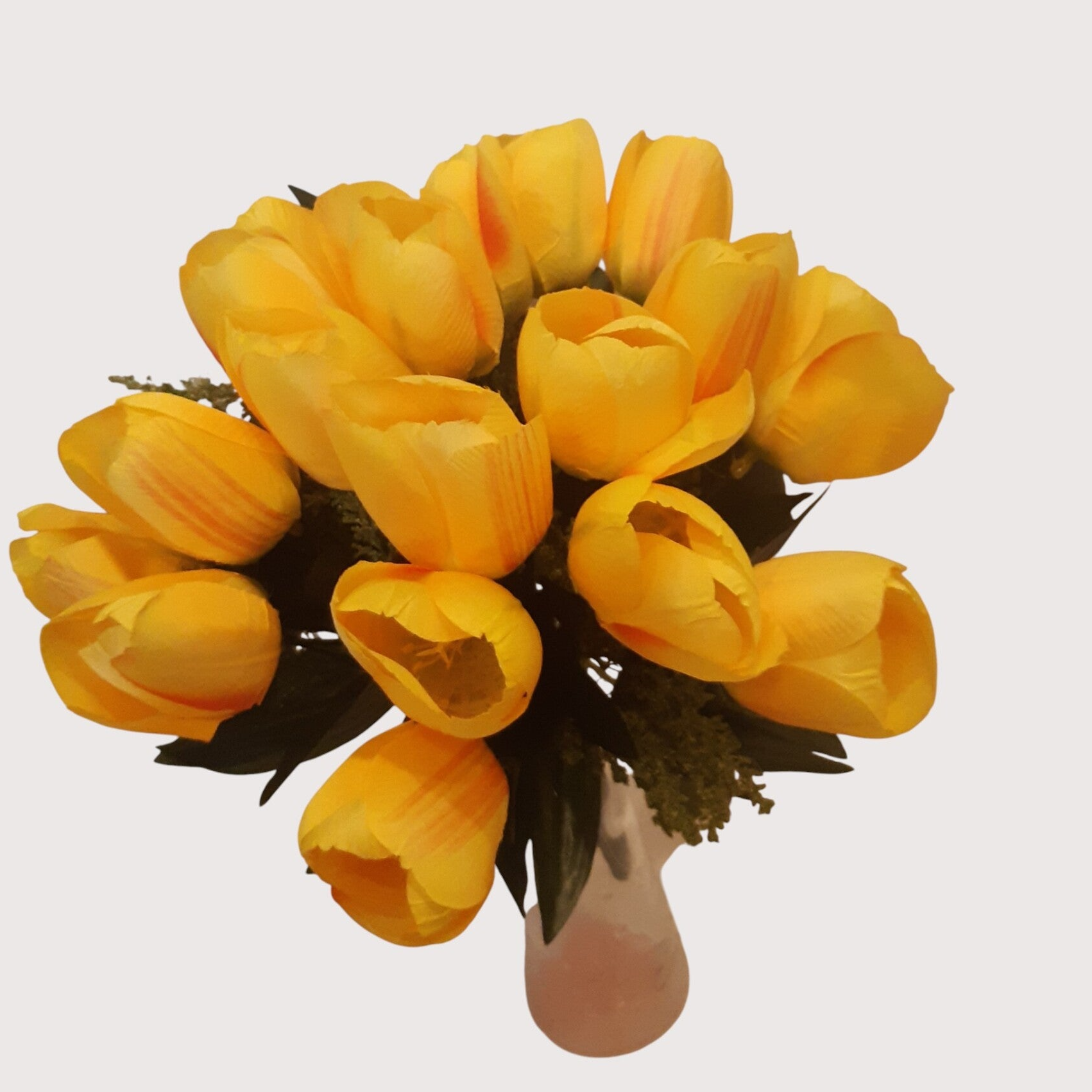 Dekoracyjny bukiet tulipanów z siedemnastoma kwiatami, o gęstej i efektownej formie. Idealny do mniejszych wazonów, stroików oraz wiosennych aranżacji wnętrz.