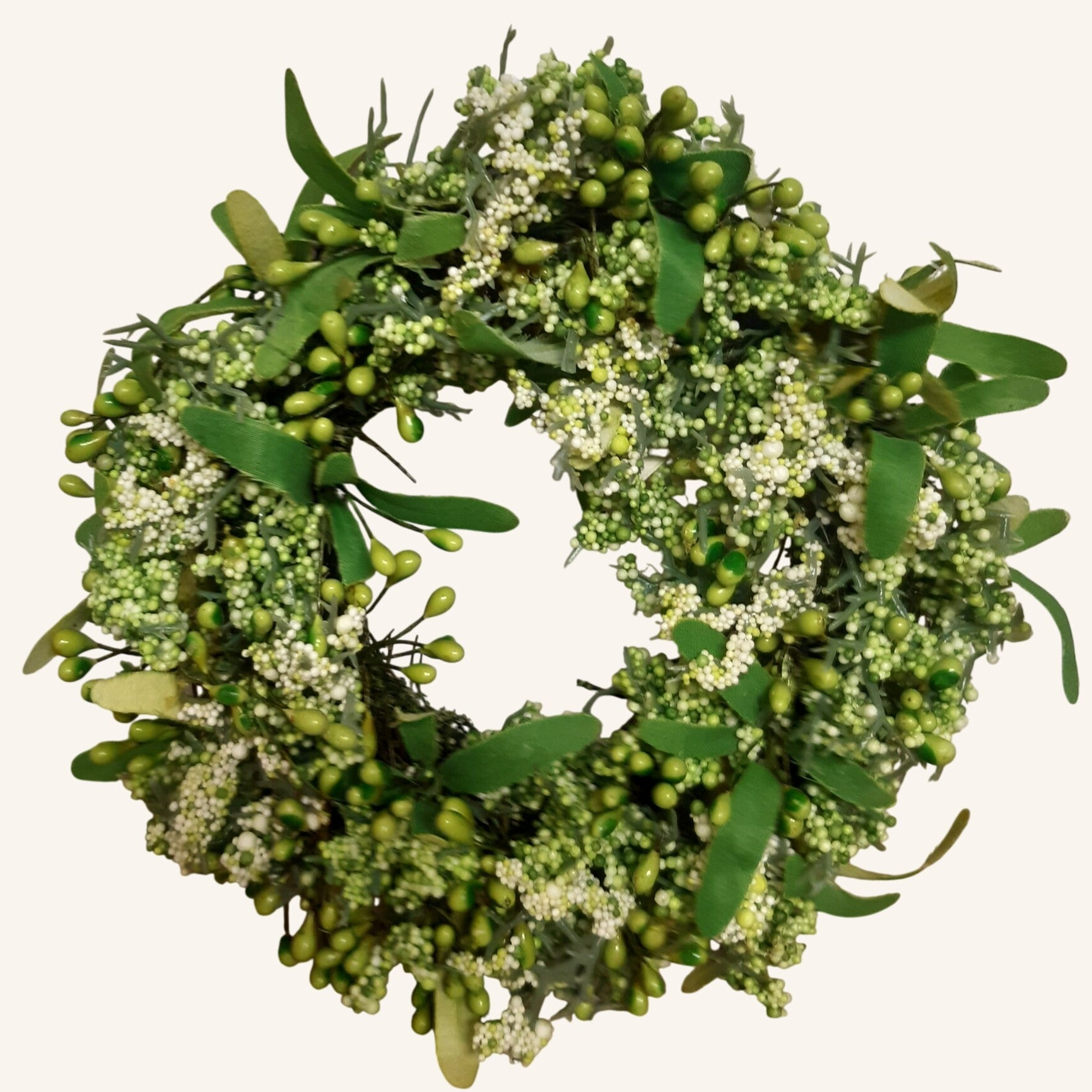 Dekoracyjny wianek z listków i drobnych kuleczek imitujących kwiatki, w formie bazy do kompozycji.